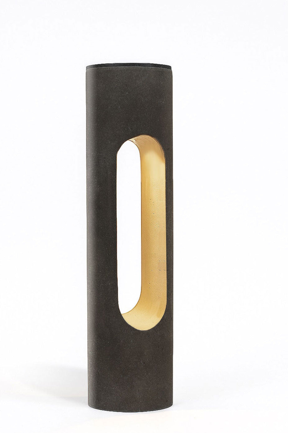 A sleek cylindrical concrete light with a rounded cutout casting an inviting glow. The solar lid houses the bulb and charges during the day, providing wire-free lighting at night.