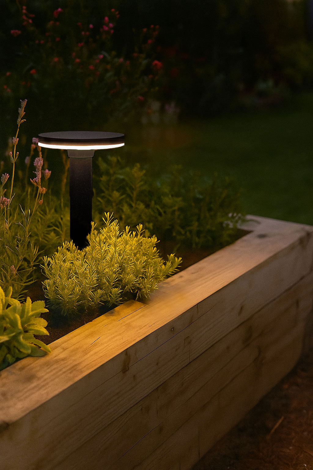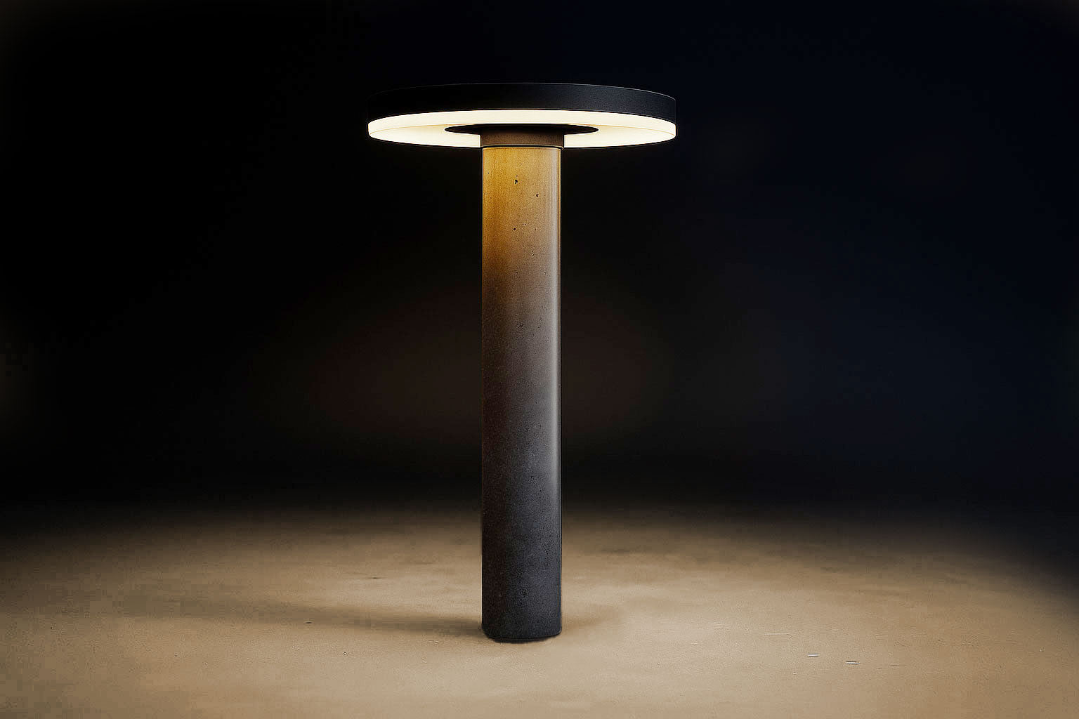 A powerful (6 volt, 5 watt) 7" solar disc mounted to the top of a 14" concrete base, casting a massive amount of light.
